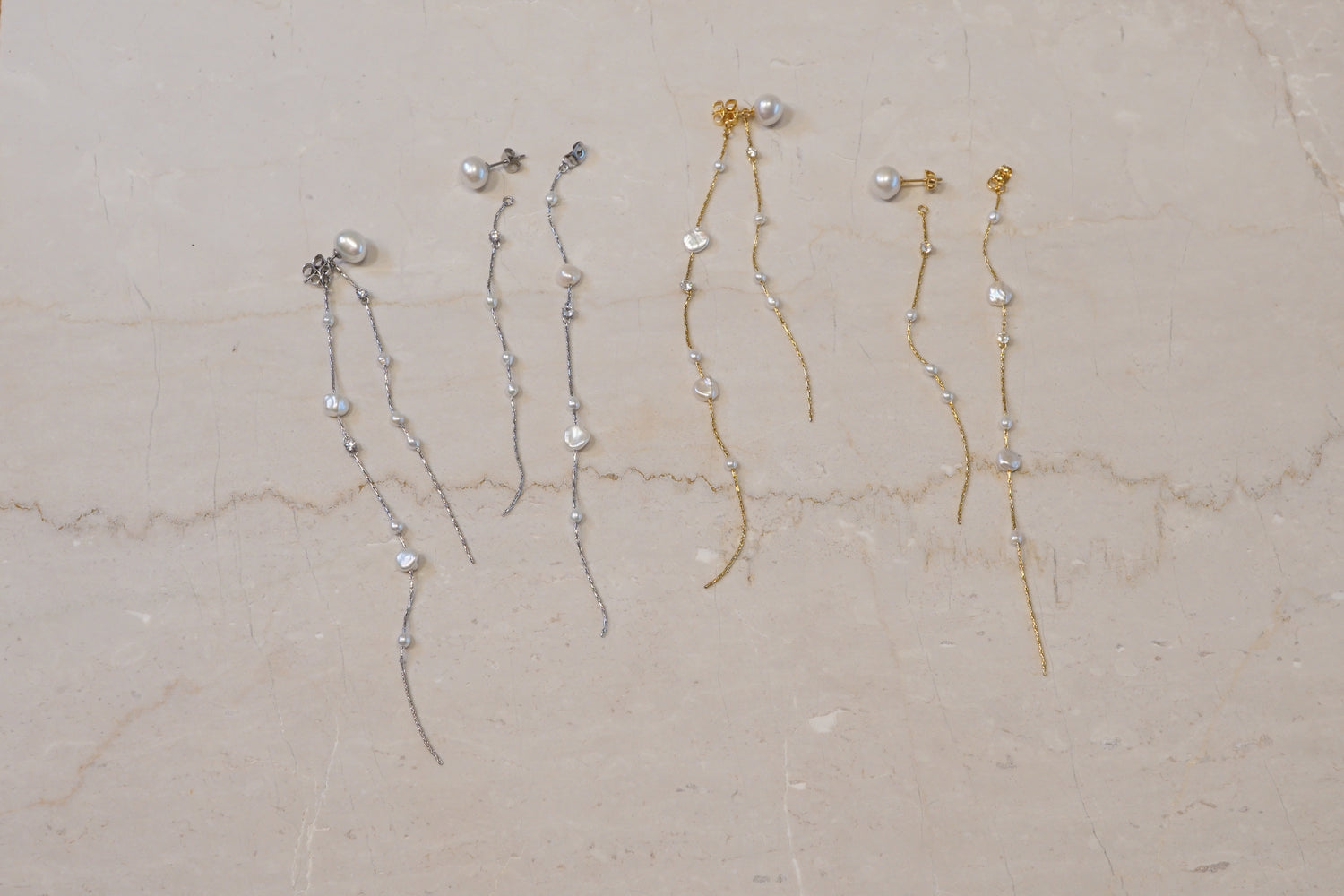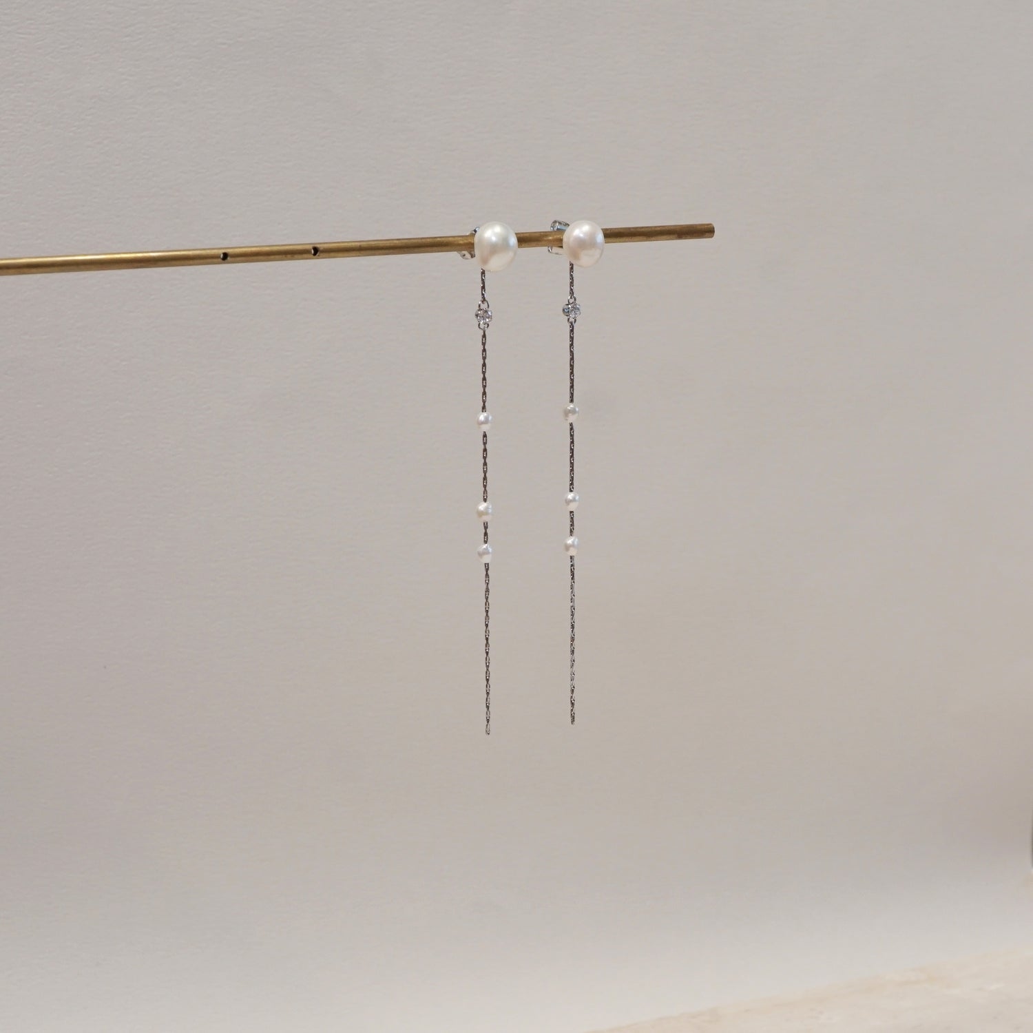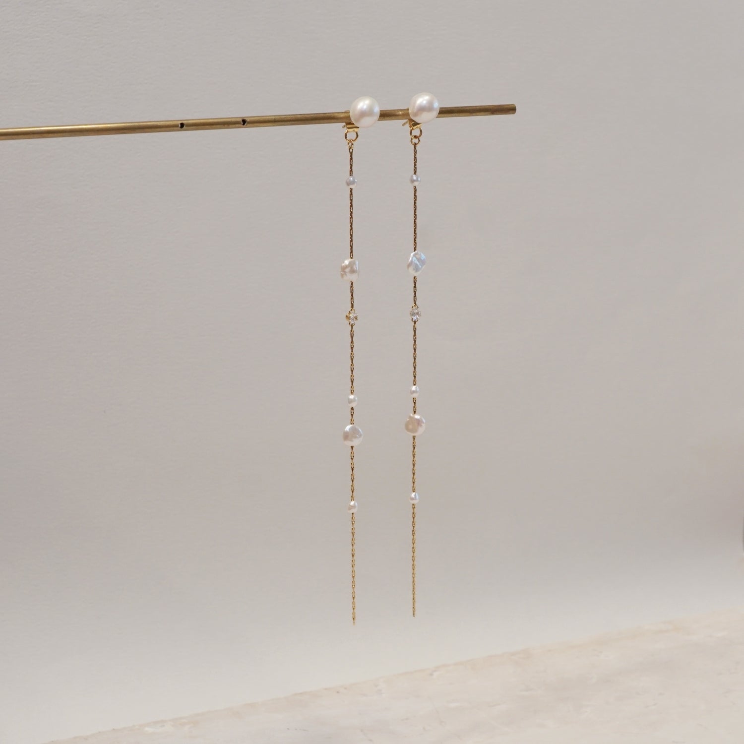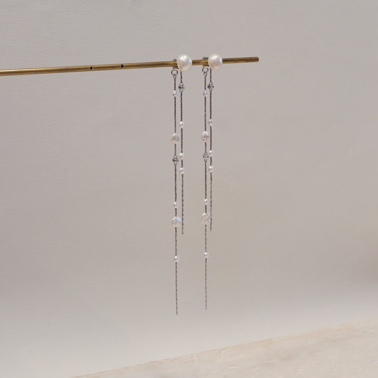 大小様々な淡水パールとモアサナイトをランダムに配置したのロングピアスは繊細なデザインながらにボリューム感もありコーディネートの主役にもなるアイテムです。